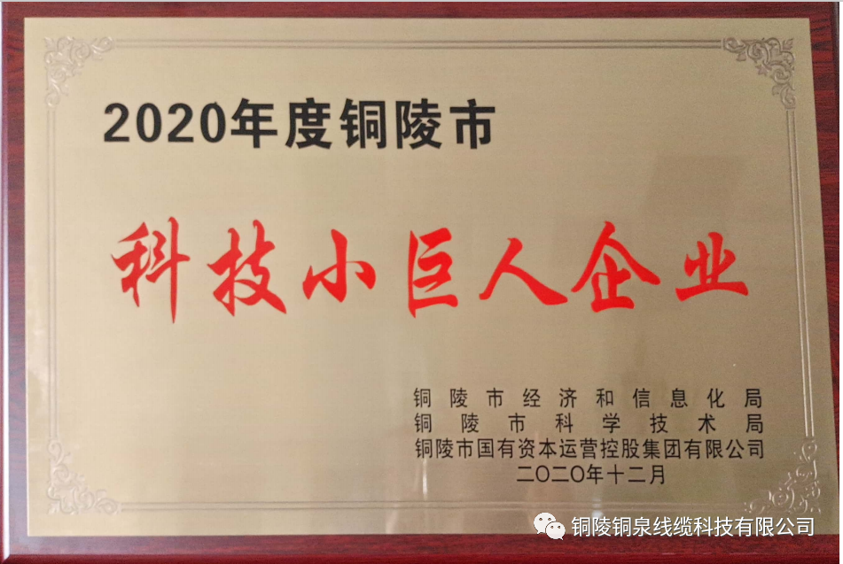 近日,銅陵市經(jīng)濟(jì)和信息化局公布了2020年度銅陵市“科技小巨人企業(yè)”,銅陵銅泉線纜科技有限公司榜上有名,成功獲評(píng)。此次榮譽(yù)稱號(hào)的獲得,體現(xiàn)了有關(guān)部門對(duì)銅泉線纜科技綜合實(shí)力的充分肯定和鼓勵(lì),是對(duì)我們堅(jiān)持科技創(chuàng)新并取得良好經(jīng)營(yíng)業(yè)績(jī)的高度認(rèn)可。