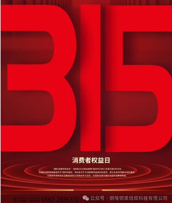 一年一度的315國際消費者權(quán)益日如期而至,今年,中國消費者協(xié)會將315主題定為“激發(fā)消費活力”,旨在優(yōu)化消費環(huán)境,推動消費從疫后恢復轉(zhuǎn)向持續(xù)擴大。眼下,刺激消費、激發(fā)活力,是經(jīng)濟發(fā)展的關鍵一步,在此背景下,切實保證消費者合法權(quán)益變得愈發(fā)重要。銅泉線纜始終堅守品質(zhì),始終秉承“以誠拓市場,用心鑄品牌”的經(jīng)營理念,以匠心,贏誠信;以責任,筑未來。315維權(quán)日我們不僅僅是參與者,更是責任的踐行者。在這個特別的日子里我們的承諾不會缺席。