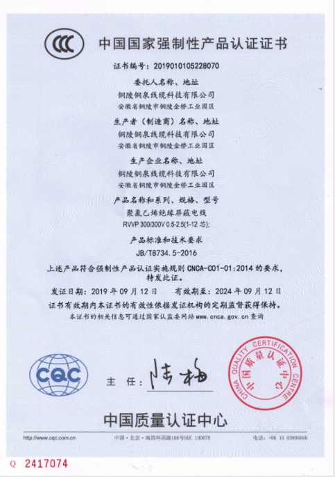 RVVP電線3C認證證書